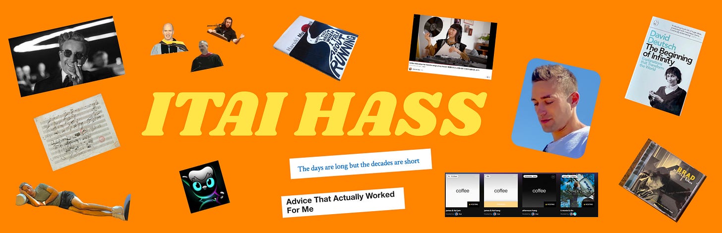 conversations with itai can’t help but be generative - what characterizes korean cinema? why is sapiens bad philosophy? what are the true boundaries of dimes square? perhaps because of his musical upbringing in tel aviv, his cs and philosophy degrees, or simply because the man is an instinctive dot-connector. in any case, here’s a taste of his inner world. enjoy!