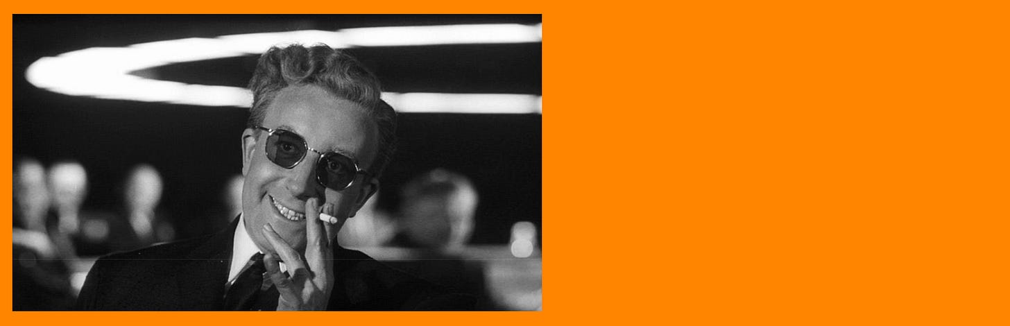 in 1964 stanley kubrick released a comedy in black and white about the world on the cusp of nuclear self destruction starring the brilliant and hilarious peter sellers playing three different characters. it’s about humanity’s triumph over nature, but also maybe doom, and how it’s all kind of poetic. (the soundtrack is immaculate.)